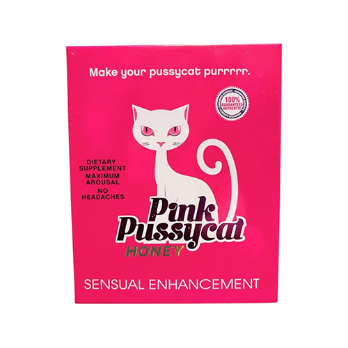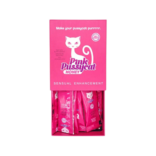 Pink Pussycat Honey is a premium dietary supplement formulated for women seeking enhanced pleasure and intimacy. Each box contains 12 individual 20g sachets, made with a unique blend of honey, royal jelly, and natural ingredients designed to support arousal, energy, and performance.